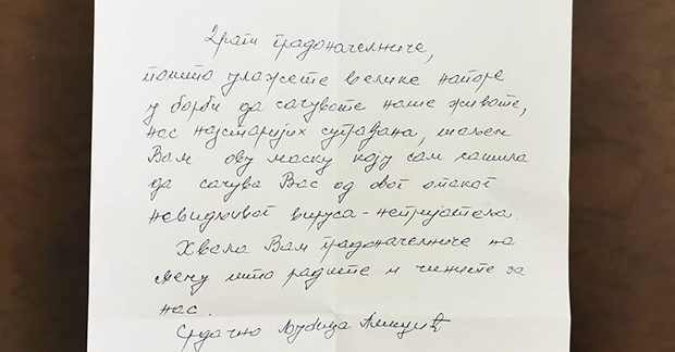 Sa Ljubičinim poklonom, gradonačelniku je stiglo i njeno pismo u kojem mu zahvaljuje na naporima koje ulaže da bi „sačuvao živote nas, najstarijih sugrađana“ i izražava nadu da će ga njena maska sačuvati od opakog, nevidljivog neprijatelja korona virusa.