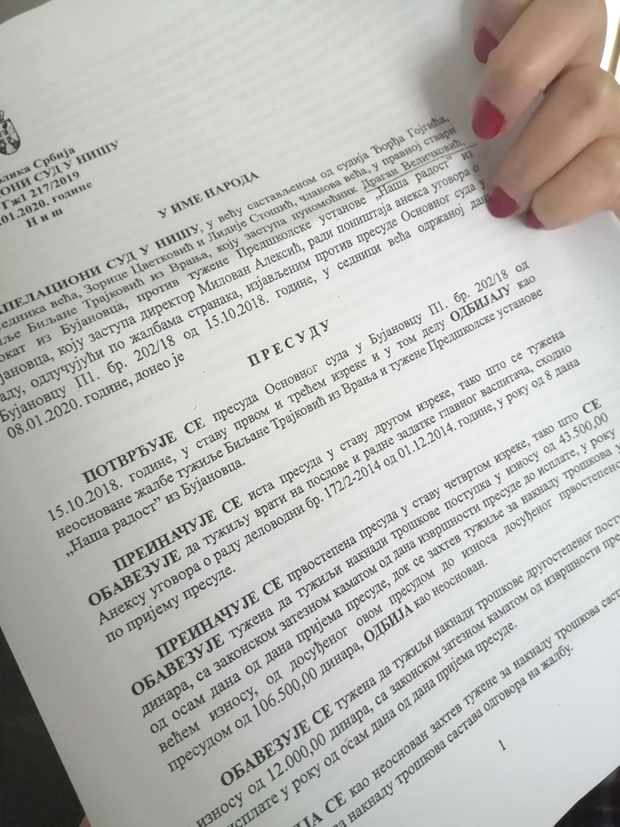 U presudi Apelacionog suda, koju nam je Biljana dostavila navodi se da se tuženi obavezuje daTrajkovićevu vrati na poslove i radne zadatke na poslovima glavnog vaspitača u roku od osam dana. Ikoje presuda iz februara meseca Biljana i dalje radi kao vaspitač u seoskom vrtiću.