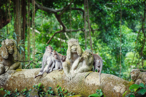 Mnoge hramove u dubini ostrva "guta" prašuma, koja se zbog kiše i povoljne klime širi neverovatnom brzinom. Najpoznatiji primer drevnog hrama, koji polako i neumitno nestaje u gustom rastinju, je u "Šumi majmuma", nedaleko od Ubuda. Šuma je zanimljiva po kolonijama majmuna, koji žive u prisnoj zajednici sa meštanima na obodu. Čitave majmunske porodice se motaju oko nogu posetilaca i vrebaju priliku da otmu neku sitnicu. Posebno su im omiljene naočare. Zavlače se i u radnjice, šetaju popločanom ulicom, sede na zidićima, ne obazirući se mnogo na povike ljudi koji pokušavaju da ih oteraju. U potrazi za hranom, odlaze u susedna sela gde im daju svež pirinač.