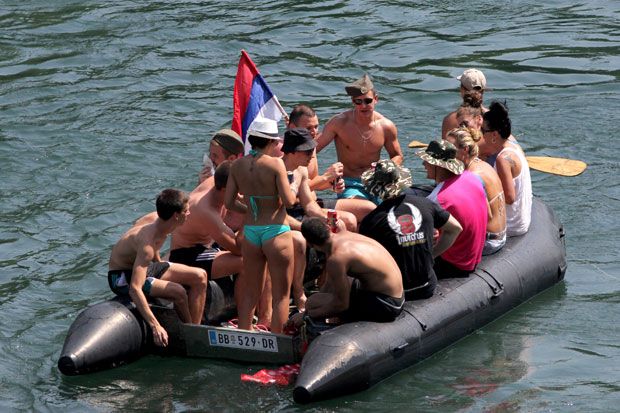 Najezdu nasmejanih lica sred Drine kilometrima prate trubači. Na obali skoro da više nikoga nema, predsednik opštine Radomir Filipović objašnjava da nema više slobodnog ni čamaca, ni smeštaja. Vijore se zastave Srbije i Srpske. I, na primer, Jamajke.