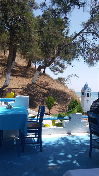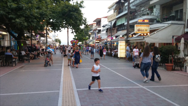 Uz tirkizno Egejsko more, na širokoj peščanoj plaži idealnoj za malu decu, nalazi se tek šest-sedam restorana koji nude ležaljke i suncobrane u zamenu za naručeno piće. Mesta, ipak, ima sasvim dovoljno i za turiste koji ne žele da plaćaju taj "luksuz" od oko tri evra po čaši soka, krigli piva ili šoljici kafe. Mesto za suncobran i peškir traži se samo vikendom, kada se "polovina" Soluna preseli na obalu.