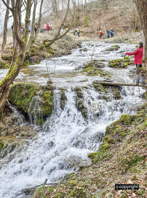 Pedesetak metara iznad njega nailazi se na pravi vilinski pejzaž kamenih stepenika obraslih nežnim zelenim biljem. Njih nabujale i uzavrele prolećne vode pokrivaju velom snežno-belih niti, koje kao strune ogromnog muzičkog instrumenta stvaraju šumnu simfoniju vodopada.