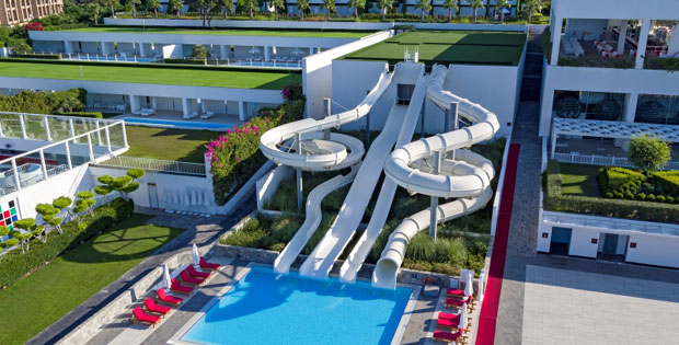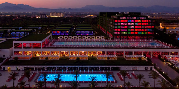 Umesto fasade, hotel je čitav prekriven zelenom, veštačkom travom. Kada se na Belek spusti noć, prozori na hotelu obasjani su raznobojnom svetlošću, a tada počinju i noćni program i animacija sa poznatim imenima DJ muzičke scene. Ni preko dana ne manjka zabave za mlade i one koji se tako osećaju. Pet otvorenih bazena, ogroman wellnes & spa centar, bogat sadržajima, i na kraju, ali nikako ne najmanje važno, 300 m duga peščana plaža sa dokom. Da li je dovoljno samo sedam dana za ovoliko zabave?