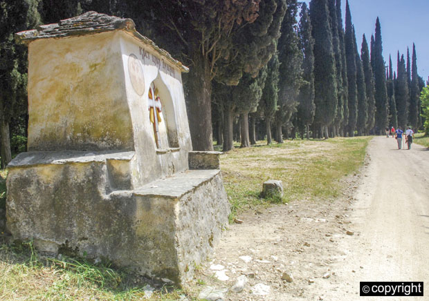 Tu počinje aleja visokih čempresa koja se završava krstom i maslinom, obleležjima mesta gde se sa svetogorcima sastao 1345. car Dušan. Atos se tad nalazio u njegovom carstvu, a srpski vladar je, prvi u istoriji monaške republike, uveo godišnje finansiranje manastira iz državnih prihoda. Najveće donacije dobili su Hilandar i Esfigmen, čiji su monasi ponudili ktitorstvo Dušanu, što je on prihvatio, a to pravo i obavezu preneo je i na sina Uroša. Pedesetak metara od ovog obeležja dolazi se do jasno označene raskrsnice na kojoj se put za Esfigmen odvaja udesno i između zelenih padina Samarije i lepih esfigmenskih vinograda vodi do starog romejskog i srpskog manastira.