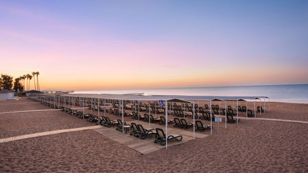 Retkost je ovako lepa plaža na obali Antalijske rivijere – tri stotine metara peščane plaže koja je okružena borovima koji daju prirodni hlad, svežeg mirisa i uz muzičku pratnju stanovnika šume. Plaža je u posedu hotela, pa je korišćenje suncobrana, ležaljki, dušeka i peškira besplatno za goste hotela.